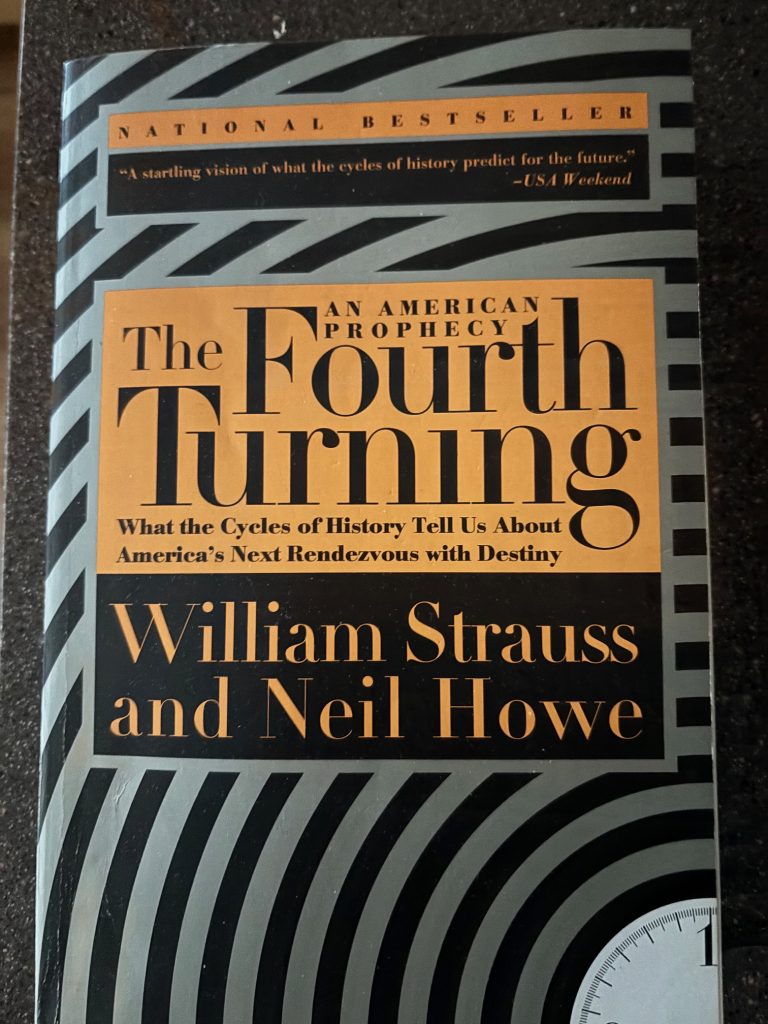 “The Fourth Turning” is a scholarly book written in 1991 by Neil Howe and William Strauss that documents human cyclical generational behavior patterns from 1584 (Reformation era) to the present. The authors (Strauss is now deceased) are university professors. Economies, wars, arts, social patterns, child-rearing, and religious movements are examined for 600 years (24 generations) and the authors convincingly demonstrate that the collective human psychology has an unrelenting pattern of generational behaviors.