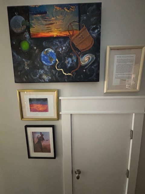 I have a wall in my home with my Aquarian aion god-images enshrined. The painted picture in the center includes my Self (green orb), the Aquarian age birth of a water bucket with the Aquarius waves symbols on it is delivering a baby from the earth. This infant is both the dawn (new aion) and sunset (end of Piscean aion). I commissioned an artist to paint it for me. The vision comes from a dream the gods sent me one night. Below to the left of the painting are photos of the earth god of a volcanic lava flow, and the work of a cosmic deity construction, a nebula spanning hundreds of light years. (I have a detailed description of my Birthing the Aquarian Age dream and painting on my website: ghellis.com)